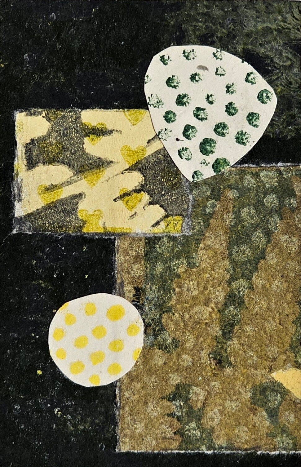 No. 0173 in the ever growing Love installation of tiny collages, ''it starts and ends with love", made in 2023. All handprinted papers.
