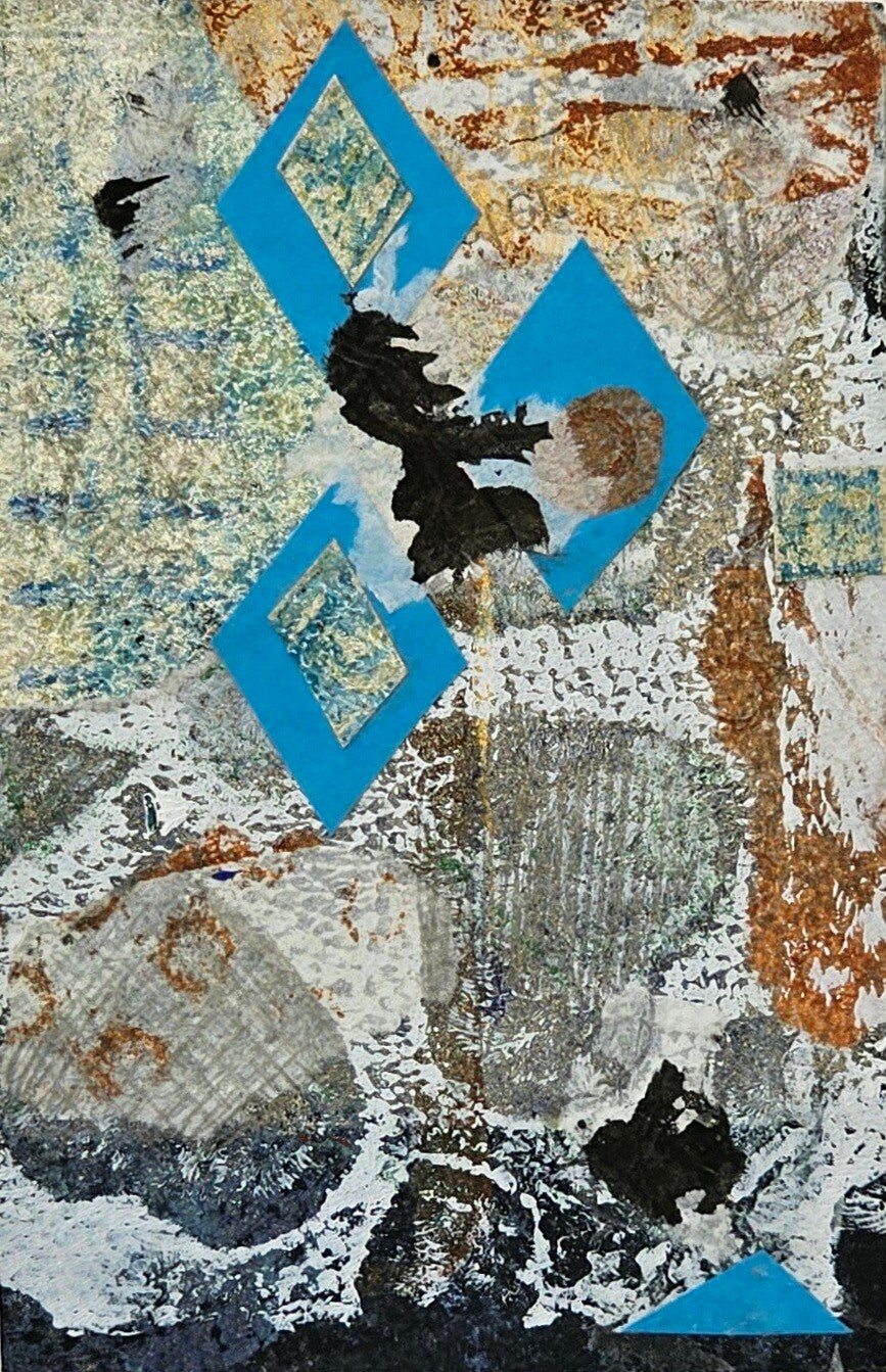 No. 0227 in the ever growing Love installation of tiny collages, ''it starts and ends with love", made in 2024. All handprinted papers.